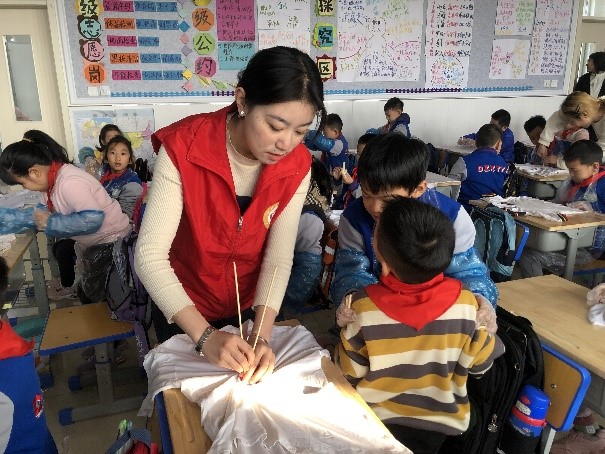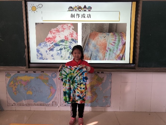活动前,志愿者向孩子们详细地介绍了扎染的工艺起源、基本知识、扎染的技巧、注意事项等。然后向孩子们展示扎染的流程,大家都睁大眼睛,看得目不转睛,生怕错过其中的任何一个环节。随后,孩子们便迫不及待地体验起来,浸湿布、绕体恤、扎皮筋、染色……扎染过程中孩子们个个脸上洋溢着灿烂的笑容,不亦乐乎。最后,在等待自己扎染成果的时候,一件件扎染好的白体恤被孩子们匆忙地打开,当看到白体恤上独一无二的花纹和色彩时,现场更是传出此起彼伏的尖叫和赞叹声。