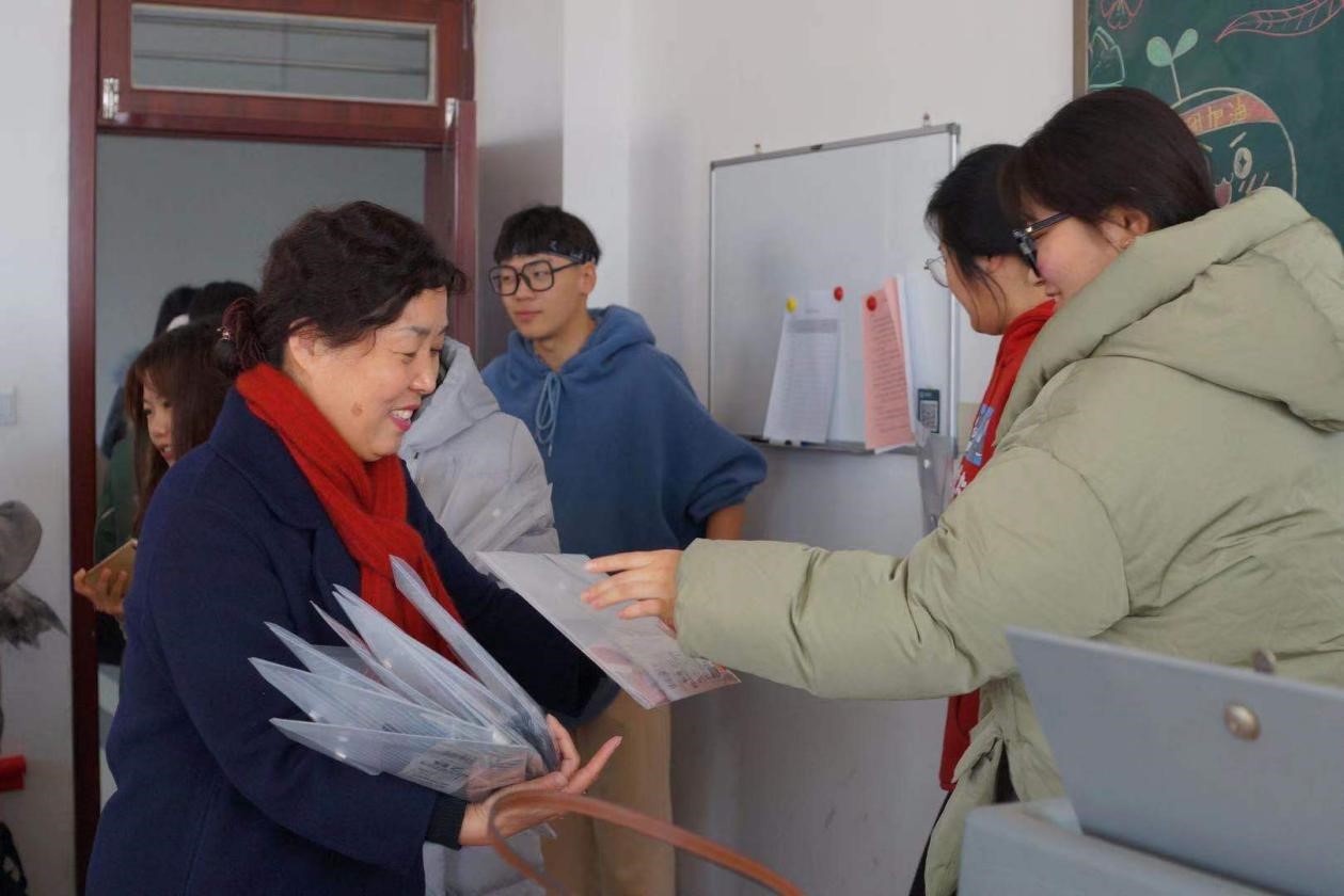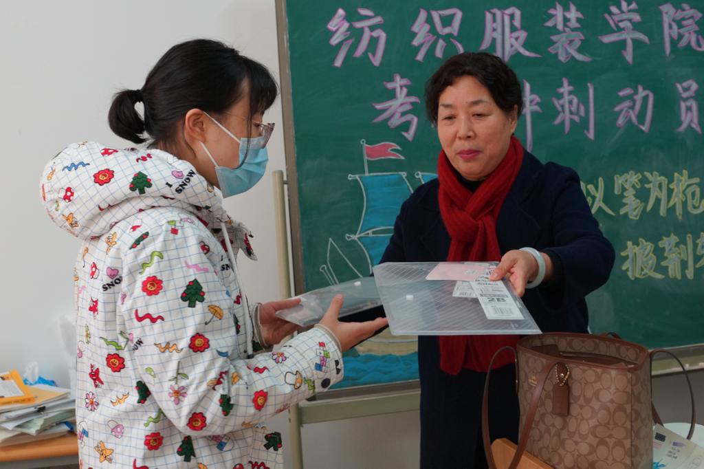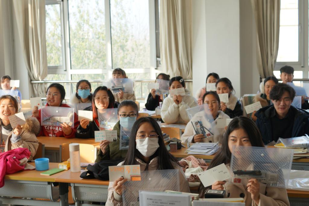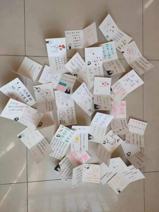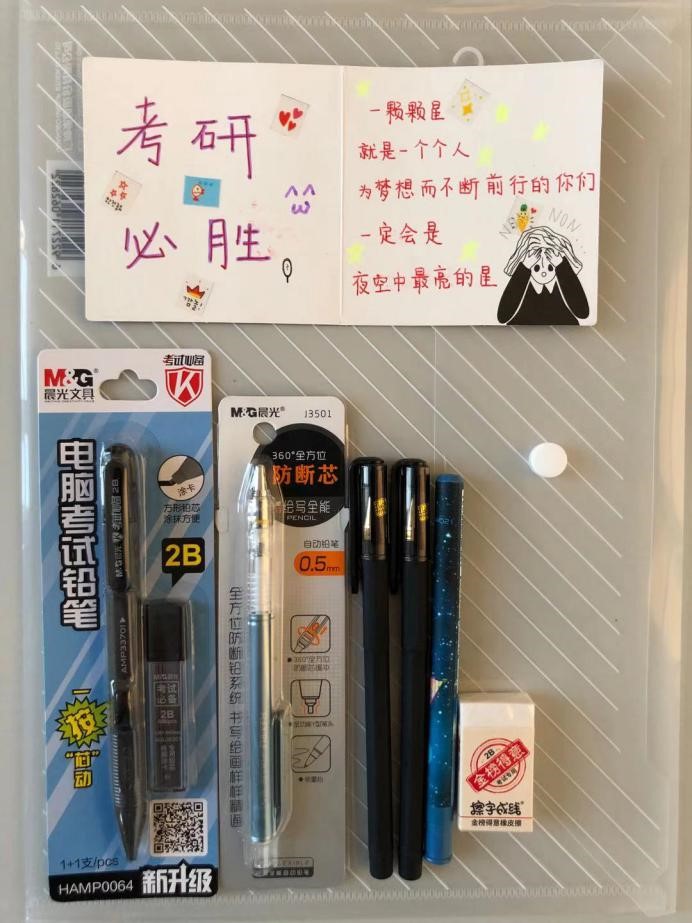 除此之外,一并送上的还有一个简洁漂亮的文具袋。每个文具袋里都是专门应对考试的特选文具,让考研生们不再为选具烦恼。袋子里还有一张张精美的卡片,卡片上是学弟学妹们的祝福。这些祝福积蓄许久,早已盼望着能传递给大四的各位考生。
