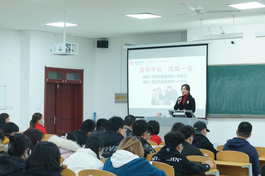 德百集团培训部张月萍部长首先对公司毕业生进行了职业生涯规划指导,张部长提到求职中最重要的是学会选择,要择己所爱、择己所长、择己所需,指导毕业生做好未来规划,内容充实,富有内涵,引人深思。随后张部长就德百集团发展历程、企业文化、人才需求及员工晋升发展渠道等方面为公司毕业生作了详情介绍,让员工充分了解德百集团,也为毕业生提供多个就业岗位。