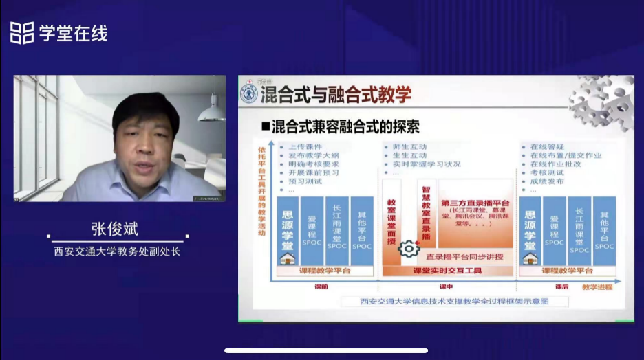 会议采用线上方式召开,教育部在线教育研究中心负责人、部分高校教务经理和处长出席会议并做了报告,报告主要围绕疫情防控常态化下的融合式教学模式、融合课堂教学质量提升措施、融合式教学的组织与管理等主题开展。