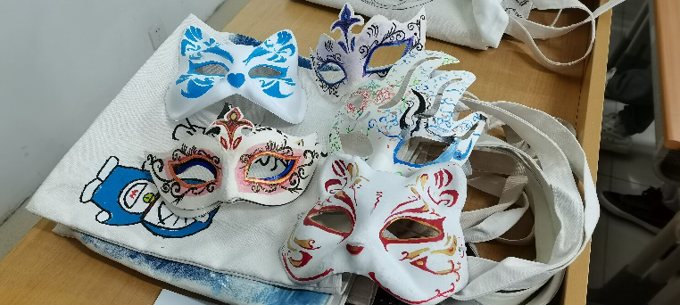 活动的一开始先讲述了面具的由来,新奇有趣的知识一下子抓住了同学们的注意力。随后介绍了面具的主要绘制方式,并提供了一些绘制素材。参与此次活动的同学们热情高涨,很快就进入状态,一起讨论绘制各种富于变化的花纹。整个活动中,社员们都积极参与,表现了极强的动手能力,充满创意的绘制思路出现在一张张面具上。