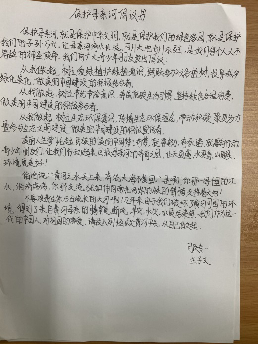 此次活动中,2020级“织梦未来志愿服务队”成员积极报名,庄严写下关于保护母亲河的承诺书,真正体现出新时代老员工的担当。保护母亲河行动,是共青团中央组织青年以保护哺育中华民族和一方人民的“母亲河”——黄河、长江及其它主要江河为主题,在“母亲河”流域以小流域为单元,大力开展治理水土流失、保护生态环境的一项重要工作,实实在在的造福于中华民族,为全球性生态平衡做出了贡献。一份份承诺书跃然纸上,一位位老员工投身生态建设,在美好的祈愿与坚定的行动下,活动圆满结束。