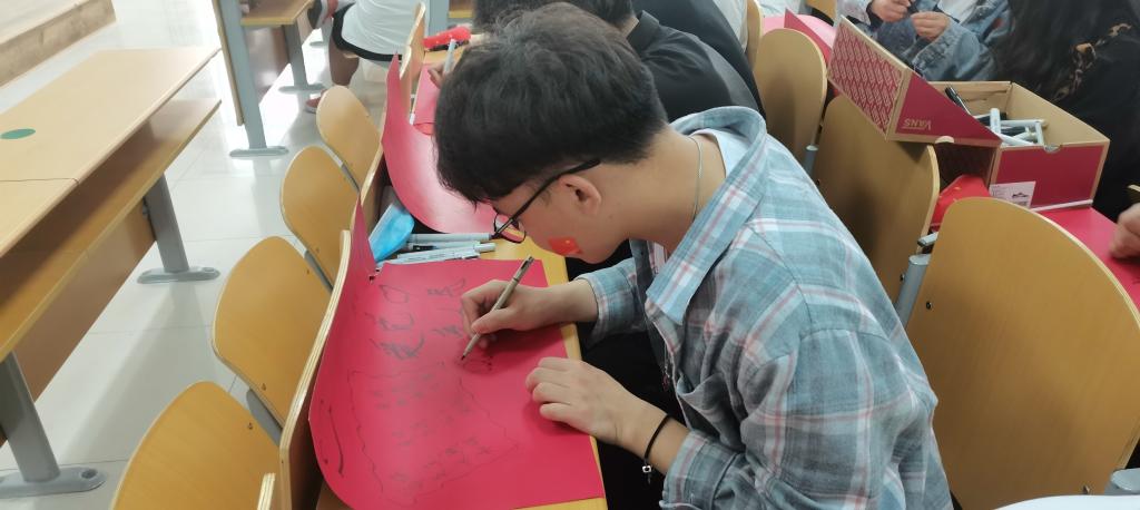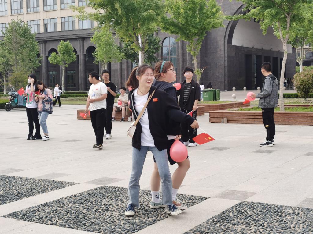 本次活动主要有三项。第一项活动为“红心向党,快乐涂鸦”室内活动,每位参与者到场中预取一张彩色纸片,在纸片上以传承红色基因为主题,随意涂鸦。所有参与者将自己的涂鸦作品经过共同努力,拼出团旗、党旗国旗等图案。第二、三项是户外活动,地点在腾飞广场。大家首先进行的是“盲人旅行”,在背景音乐声中,每个人戴上眼罩扮演一个盲人,独自一人穿越降碍旅程,体验盲人的无助、艰辛、甚至恐惧。接着是“红心向党,勇往直前”活动,每两位同学成一组,每次两组,进行背对背夹气球,终点处放置小国旗,同学们需要从起点跑到终点,全长20米,先到达终点者获胜。所有参赛者到达终点后,结合建党100周年以及四史学习教育,唱红歌,分享感受。