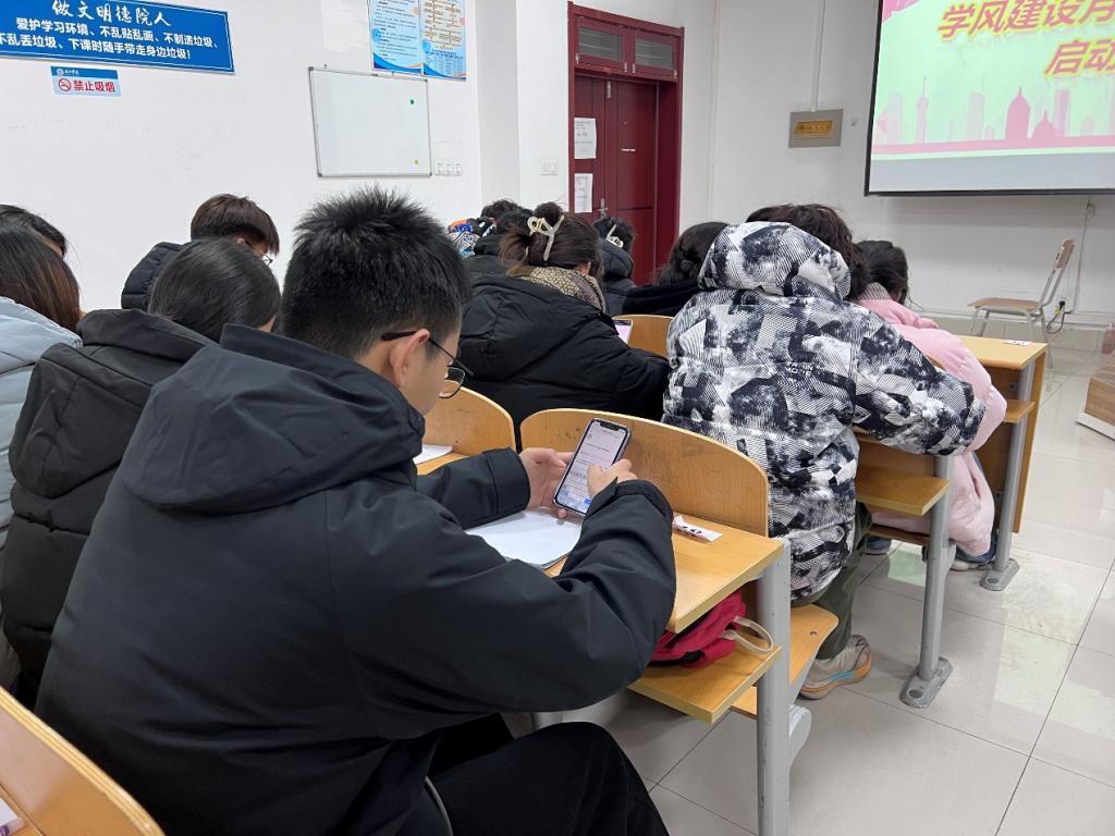 另外,为推进班级良好学风建设,活动现场还对在场同学进行了“学风建设”主题的调查问卷,通过问卷切实了解各班级在学风建设方面存在的不足,从而根据各班级实际情况制定目标明确、切实可行、内容得当的班级学风建设公约。在场的班级负责人也相互进行了深入交流,他们纷纷表示要以身作则,充分发挥员工骨干的“领头羊”作用,自觉践行“老员工行为准则”,增强建设优良学风的自觉性,在班级中形成“自我教育、自我管理、自我服务”的良好氛围,形成长效的学风建设机制。